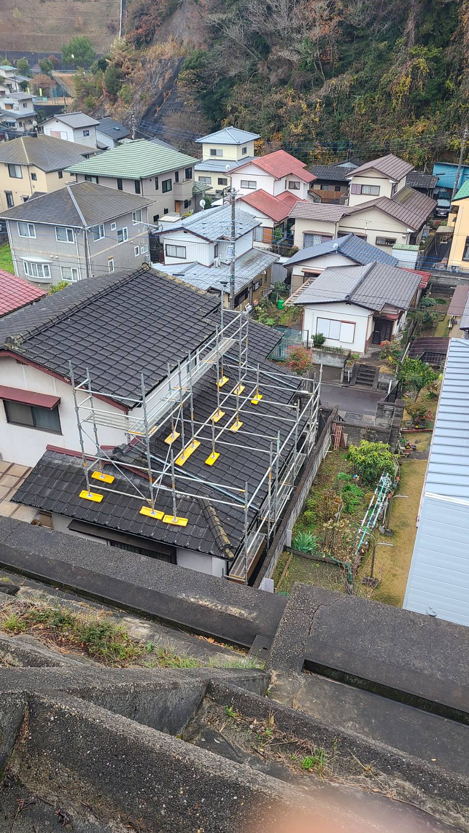 屋根改修足場組立て完了。