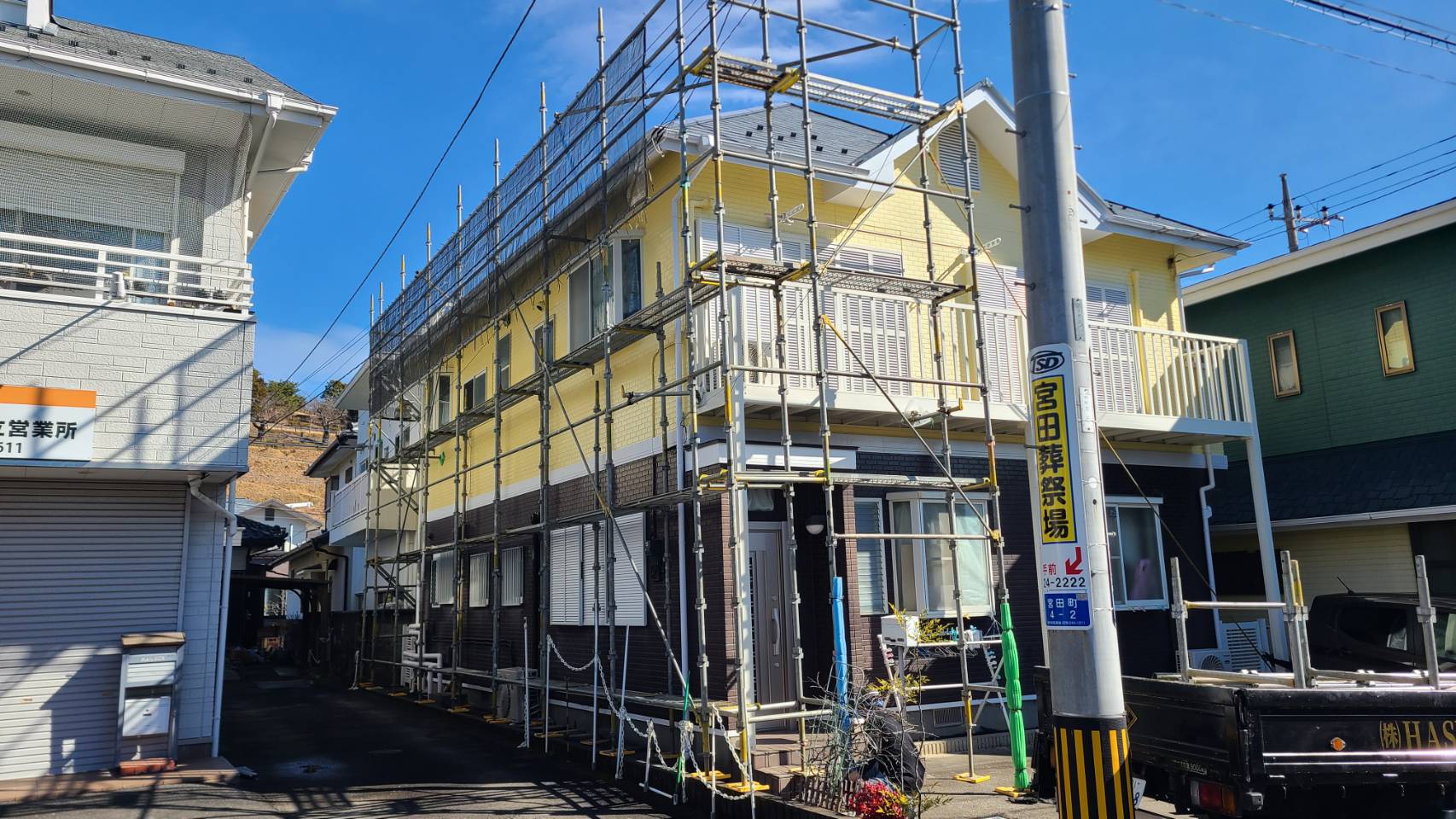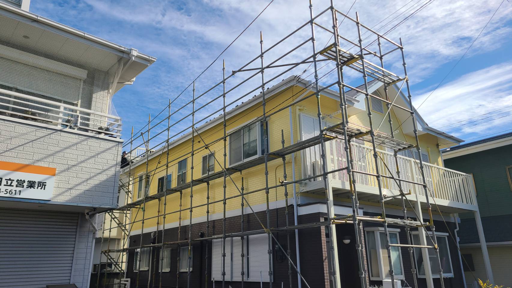 雪止め設置による部分足場組立て完了。