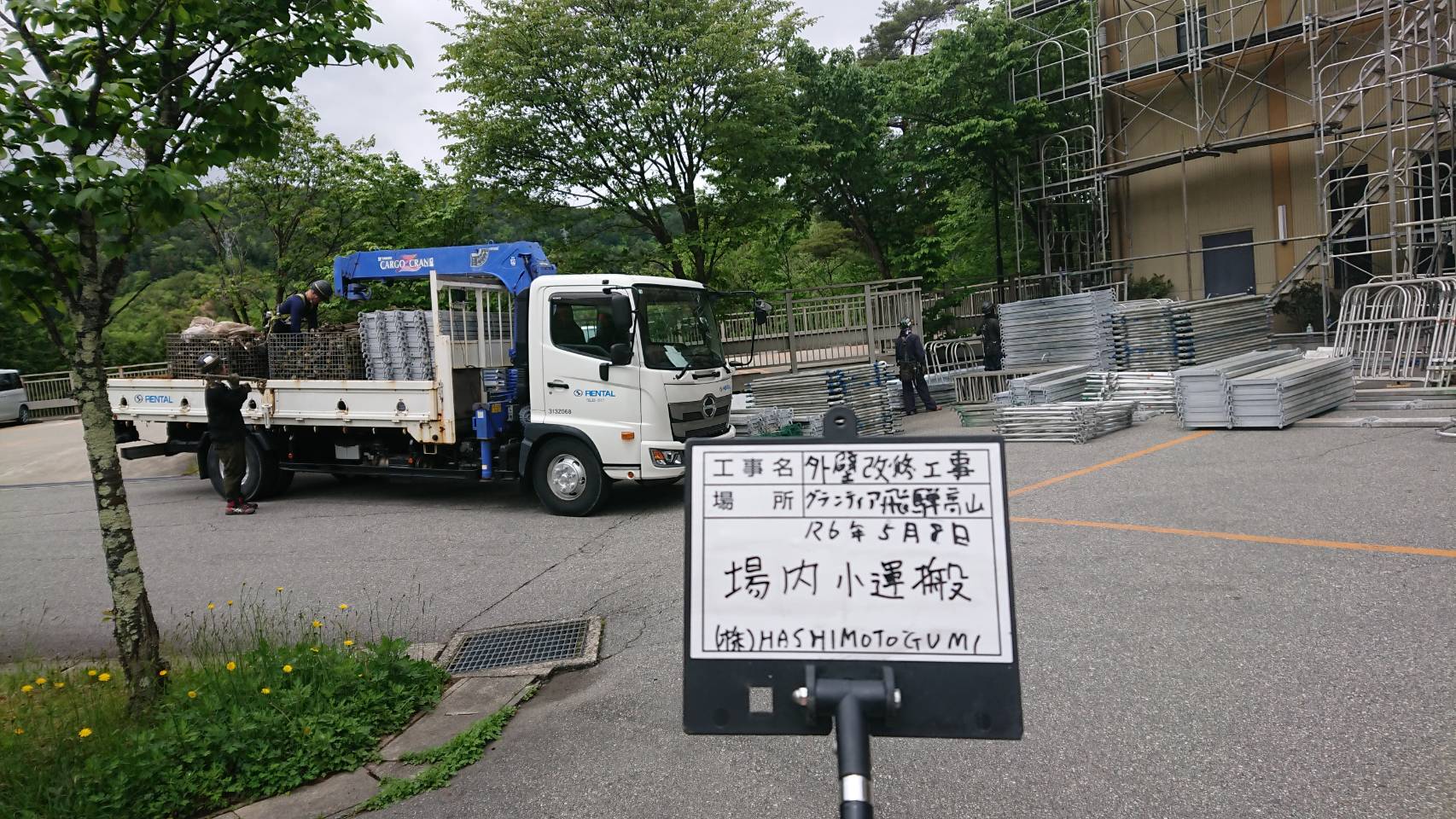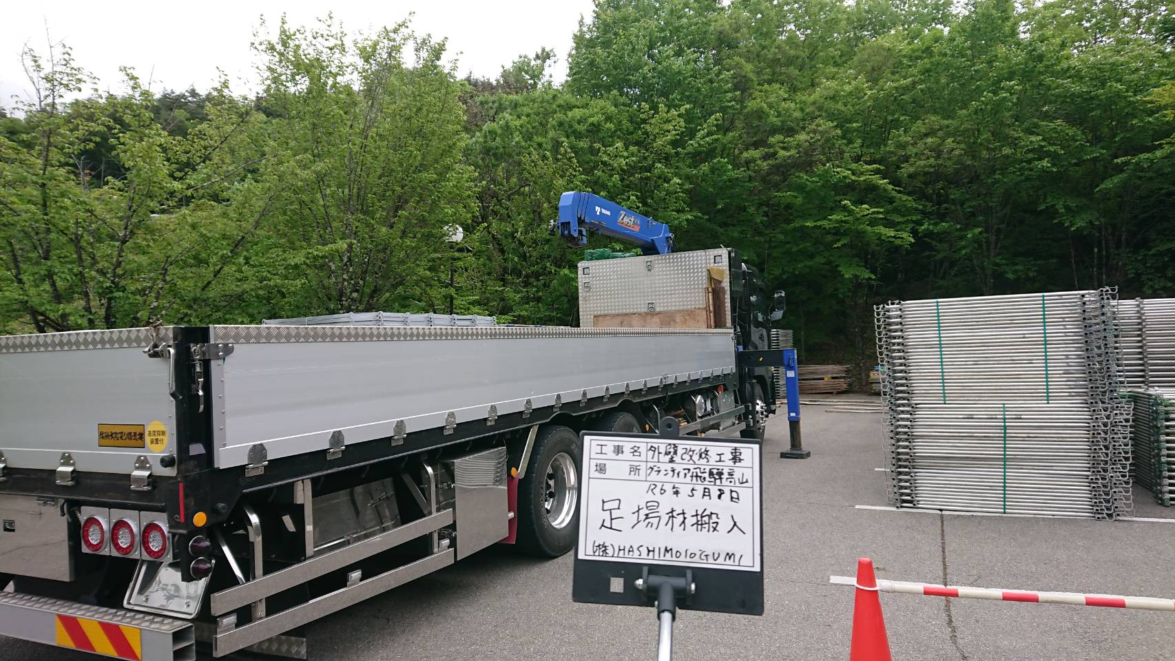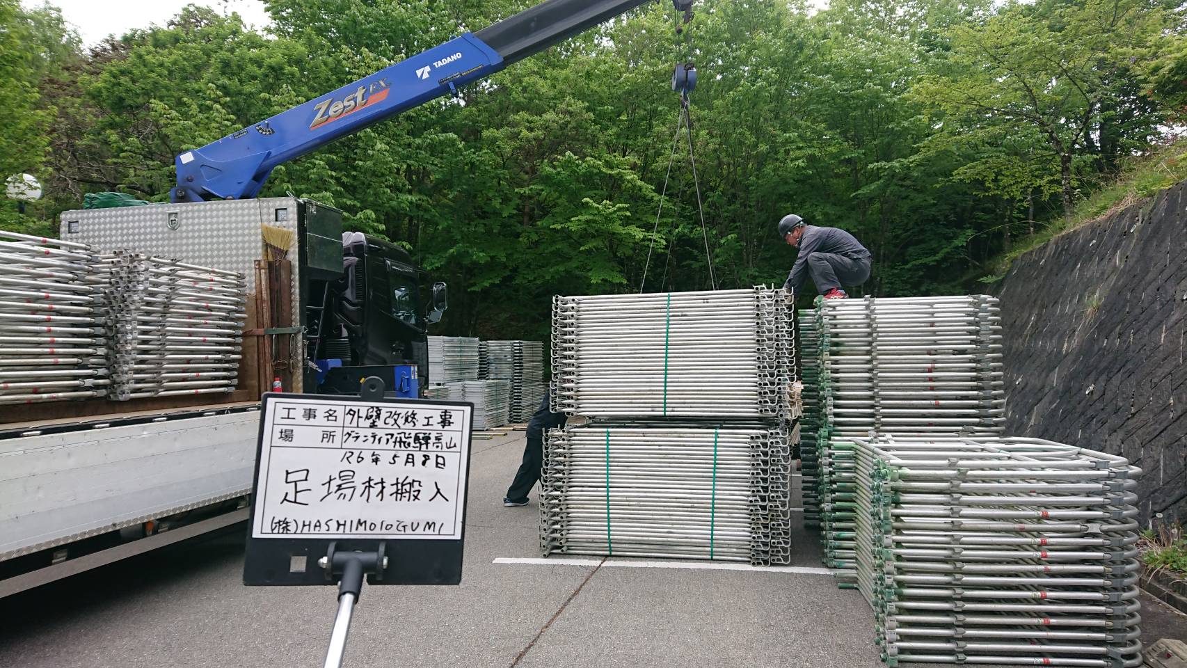 引き続き大型仮設資材運搬と足場組立て。