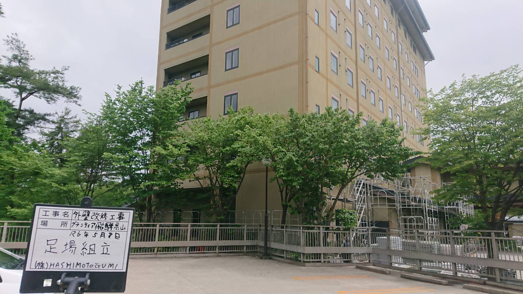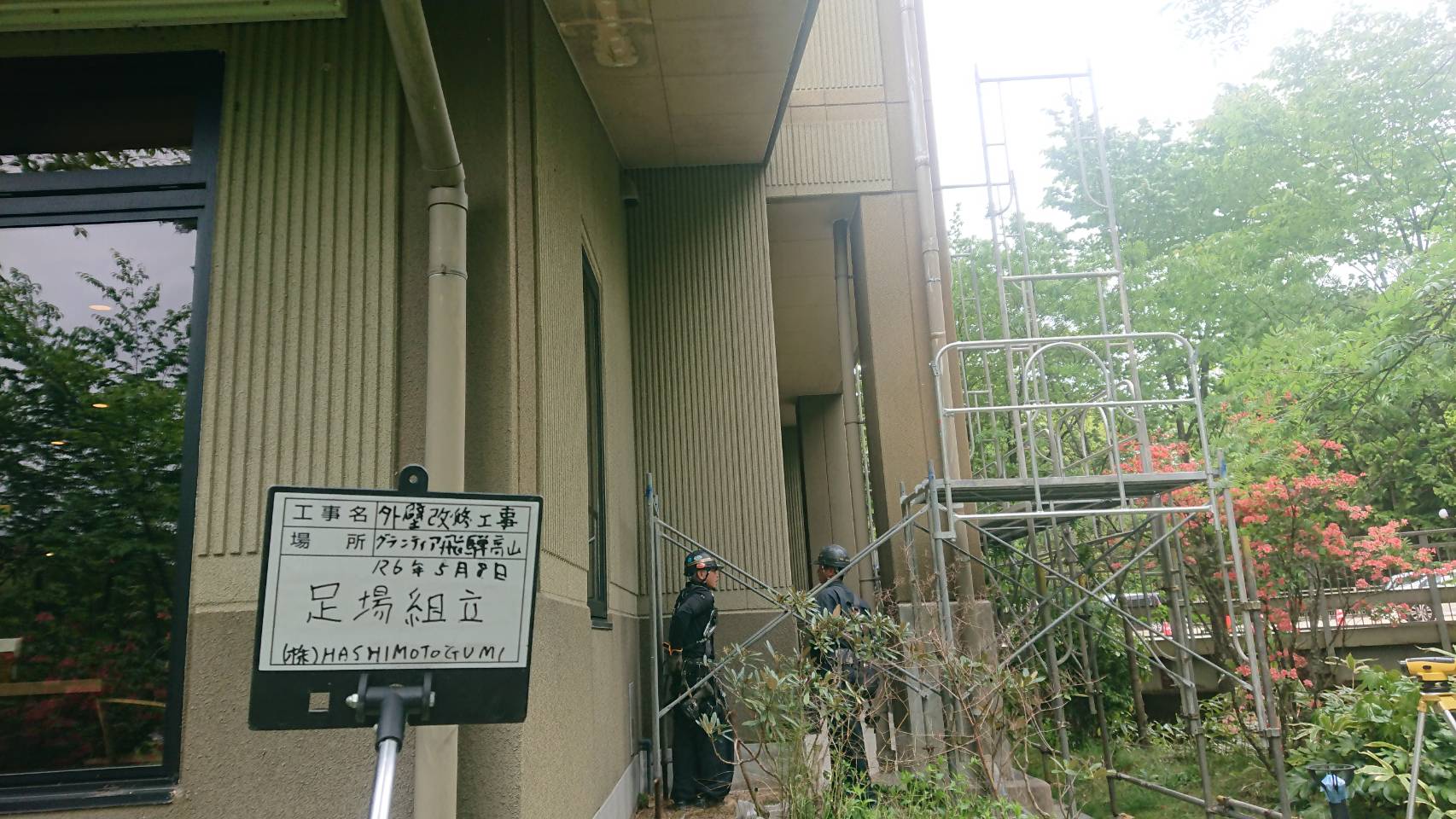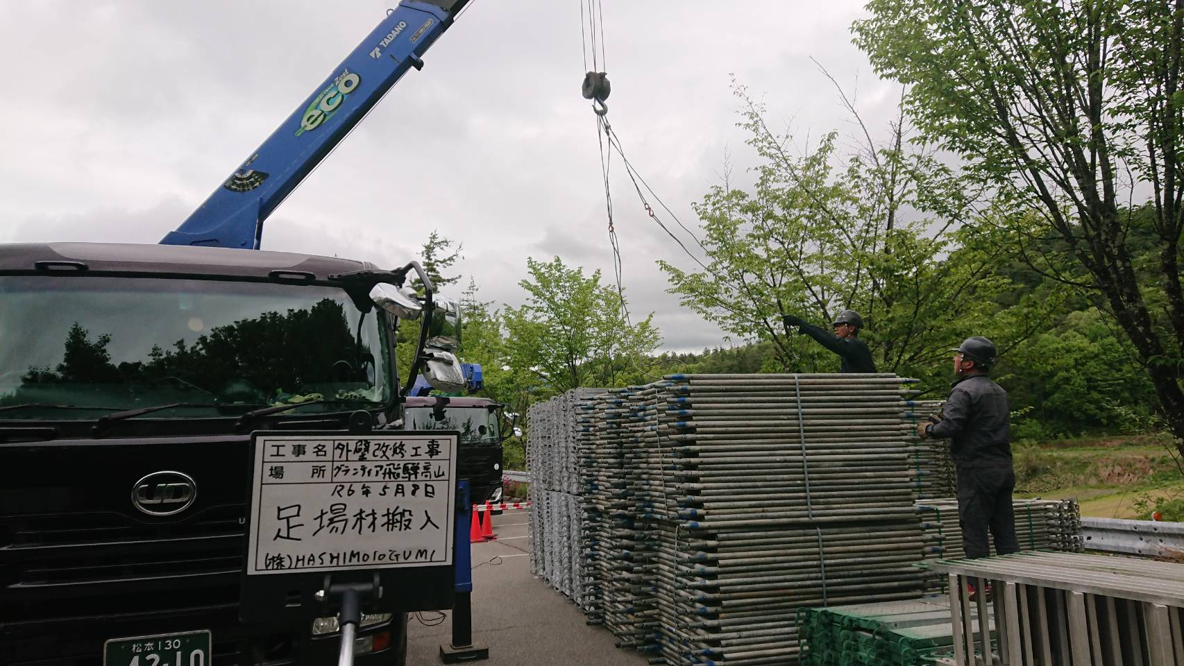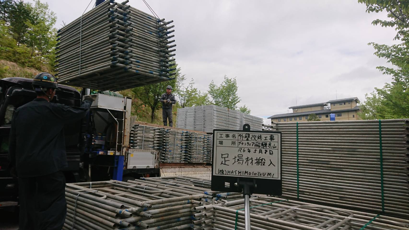 引き続き大型仮設資材運搬と足場組立て。