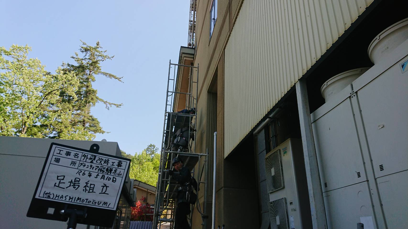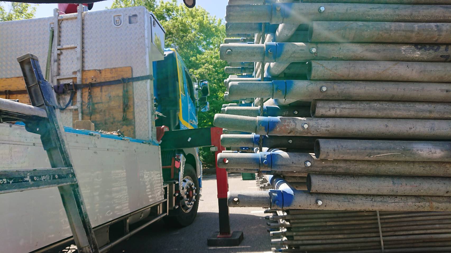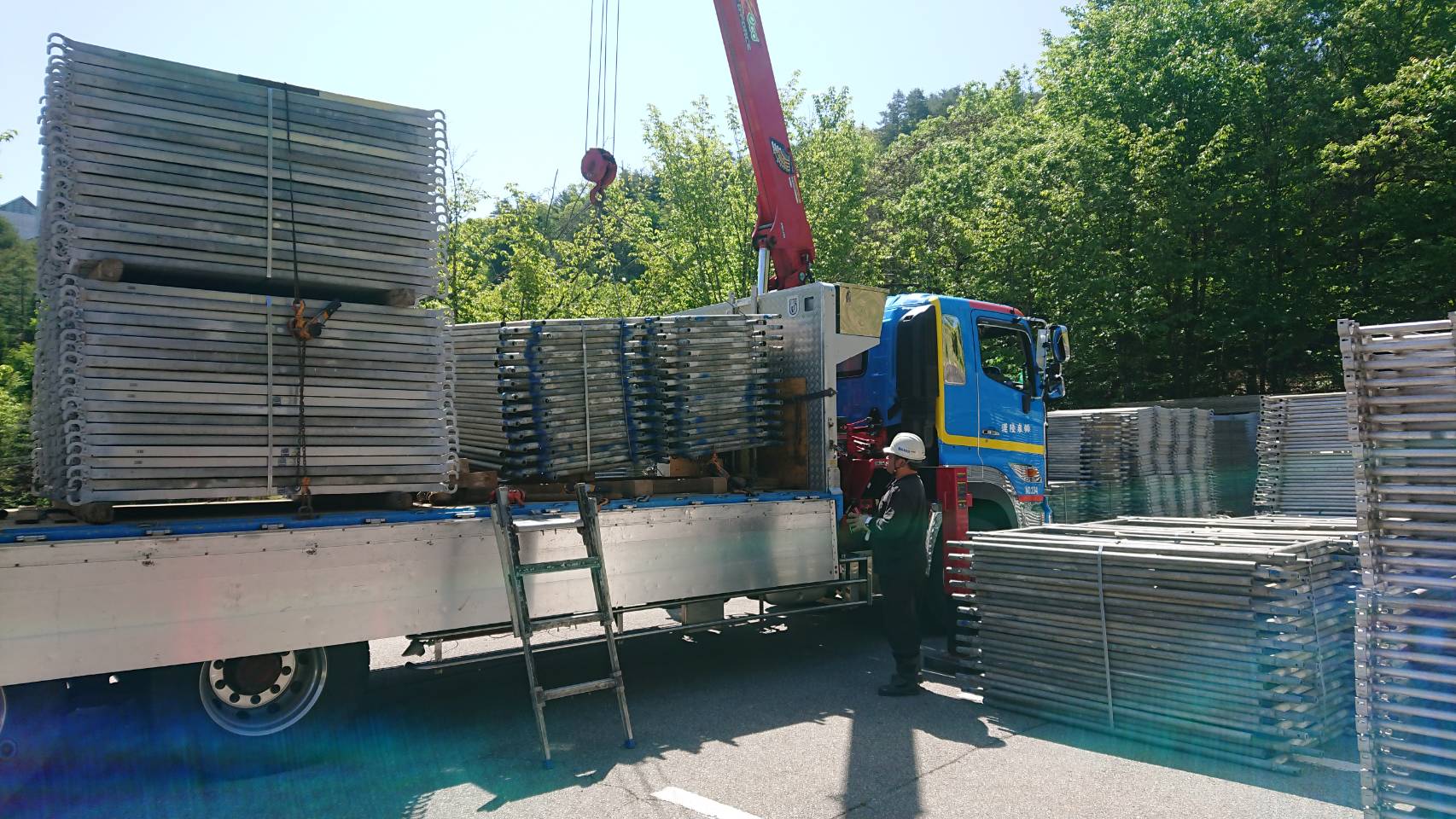 引き続き大型仮設資材運搬と改修用足場組立て。