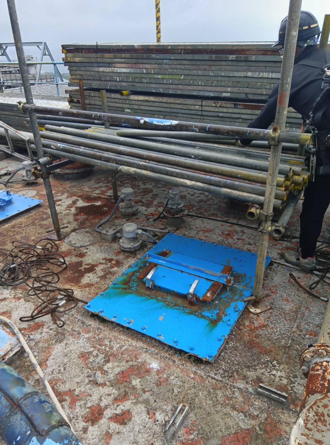 某工場の塗装用足場材荷下ろし。