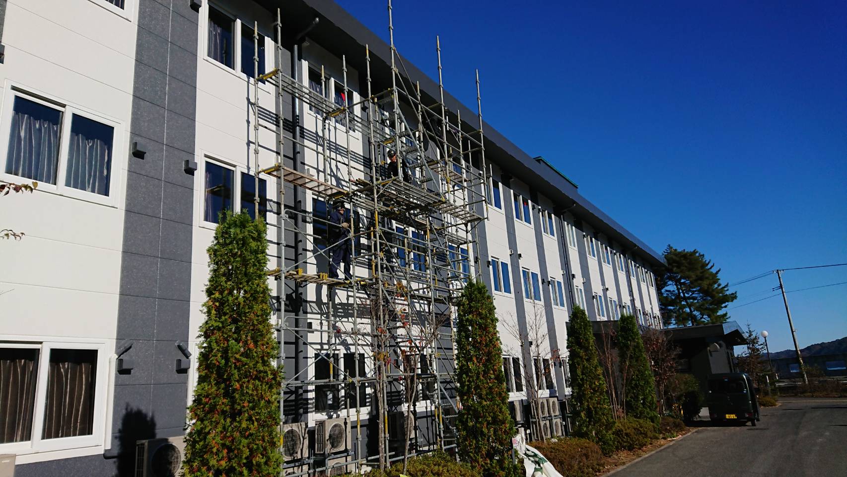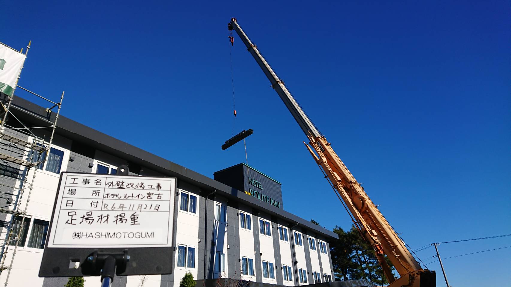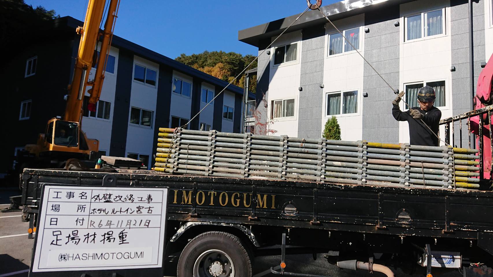 引き続き西館改修用足場解体と中庭資材レッカー作業等。