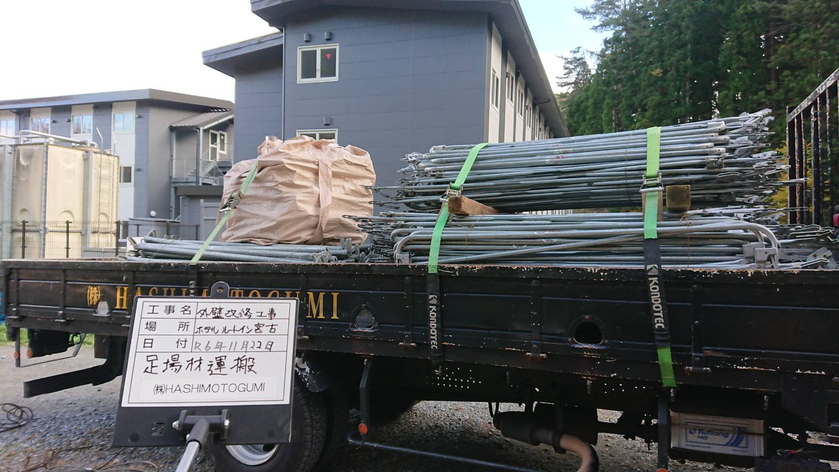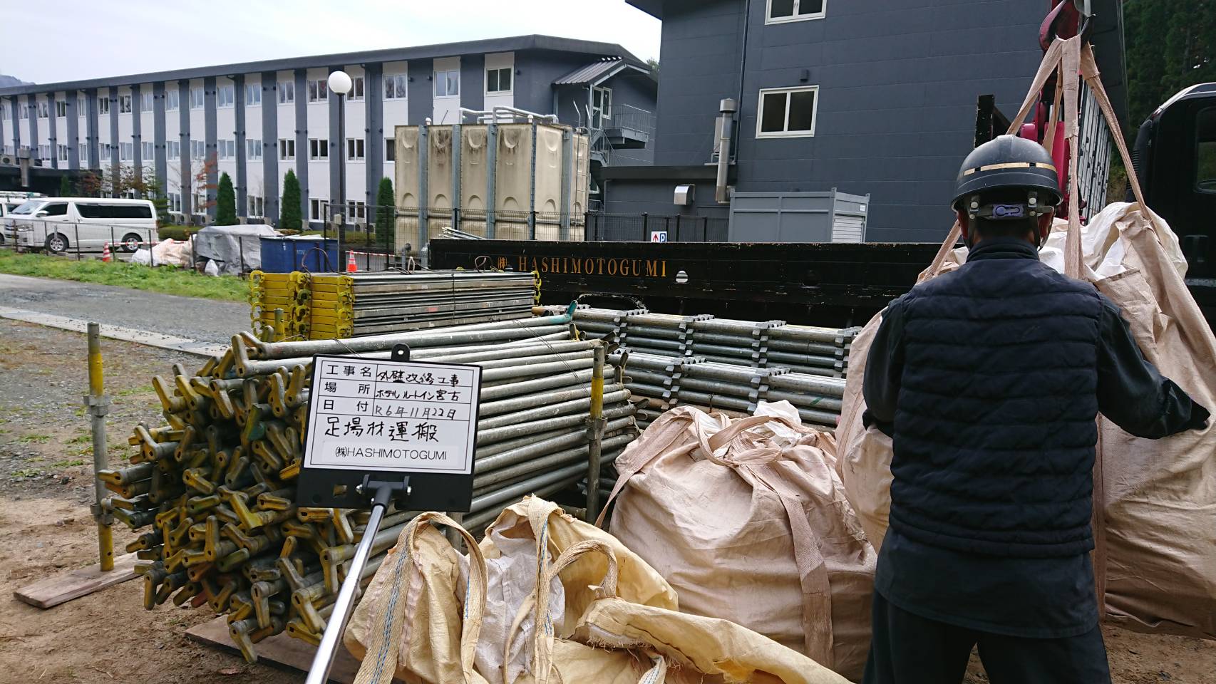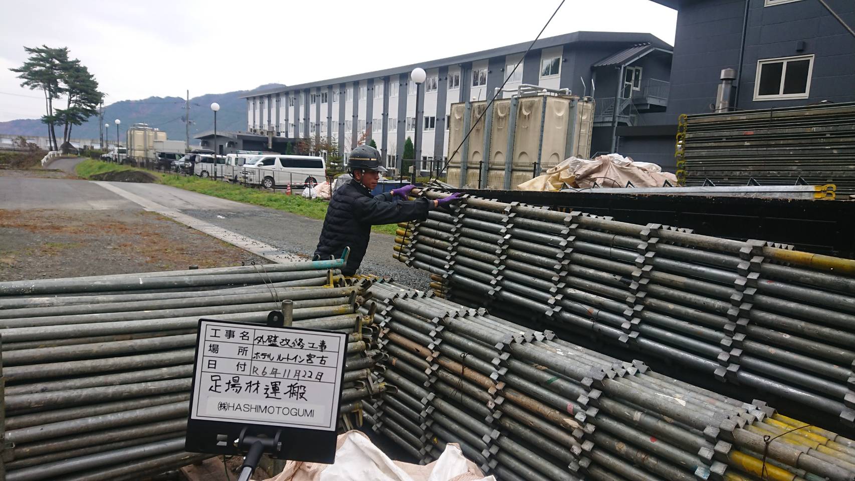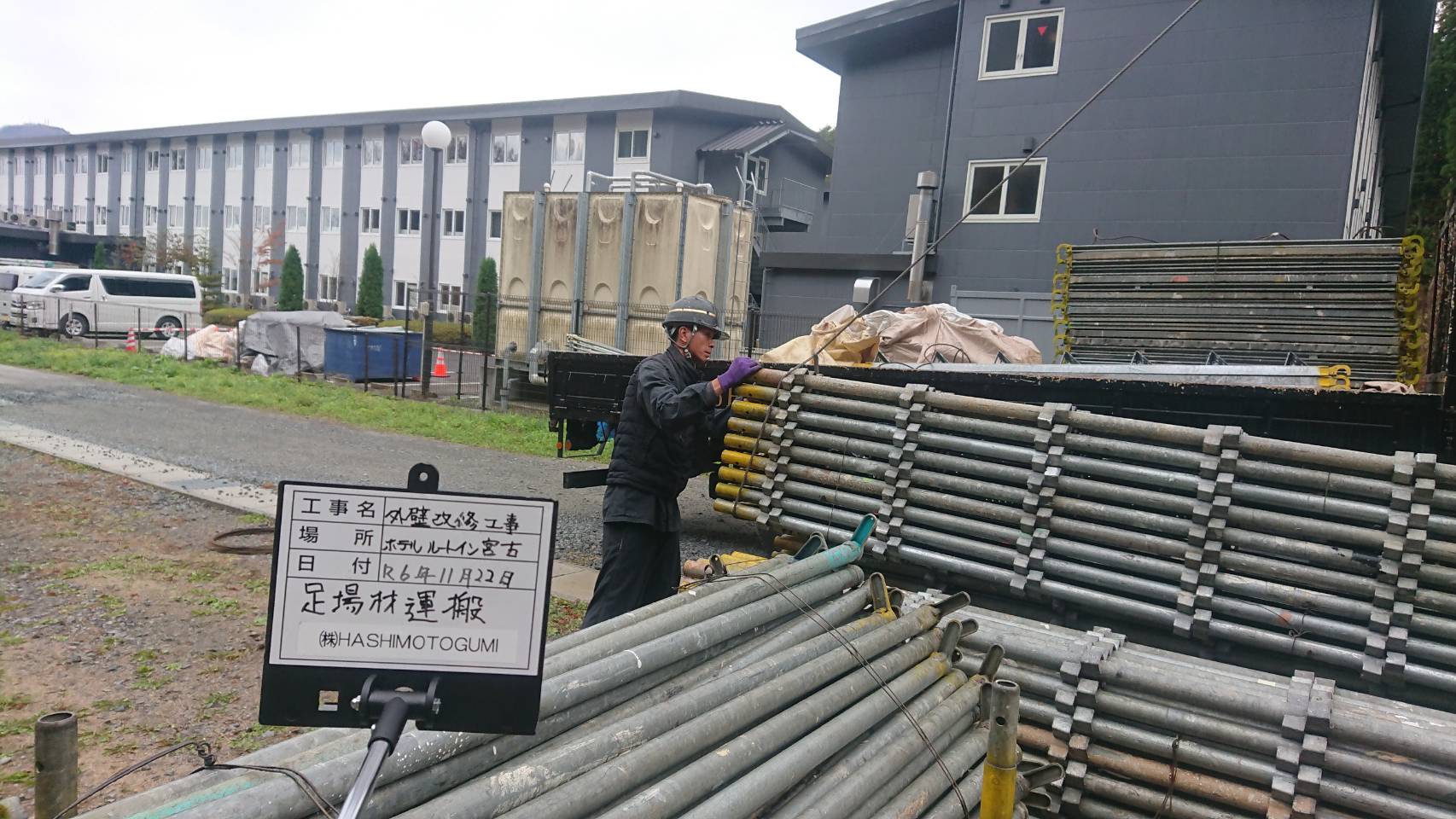 引き続き西館改修用足場積込み片付け等。