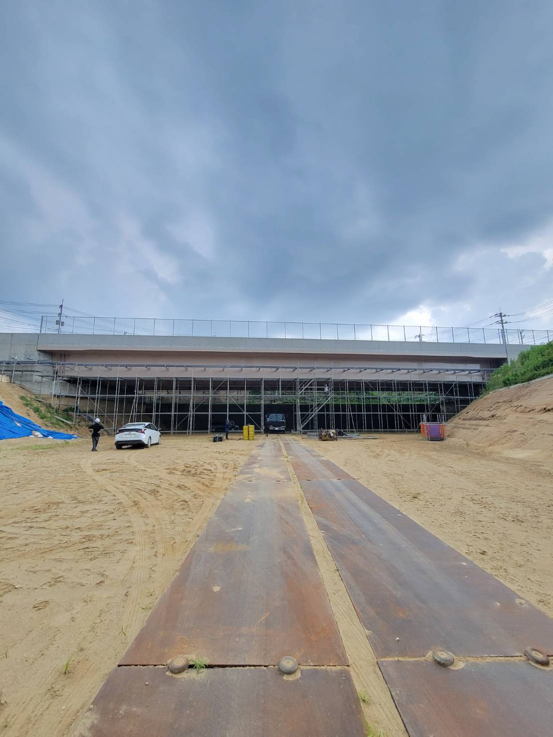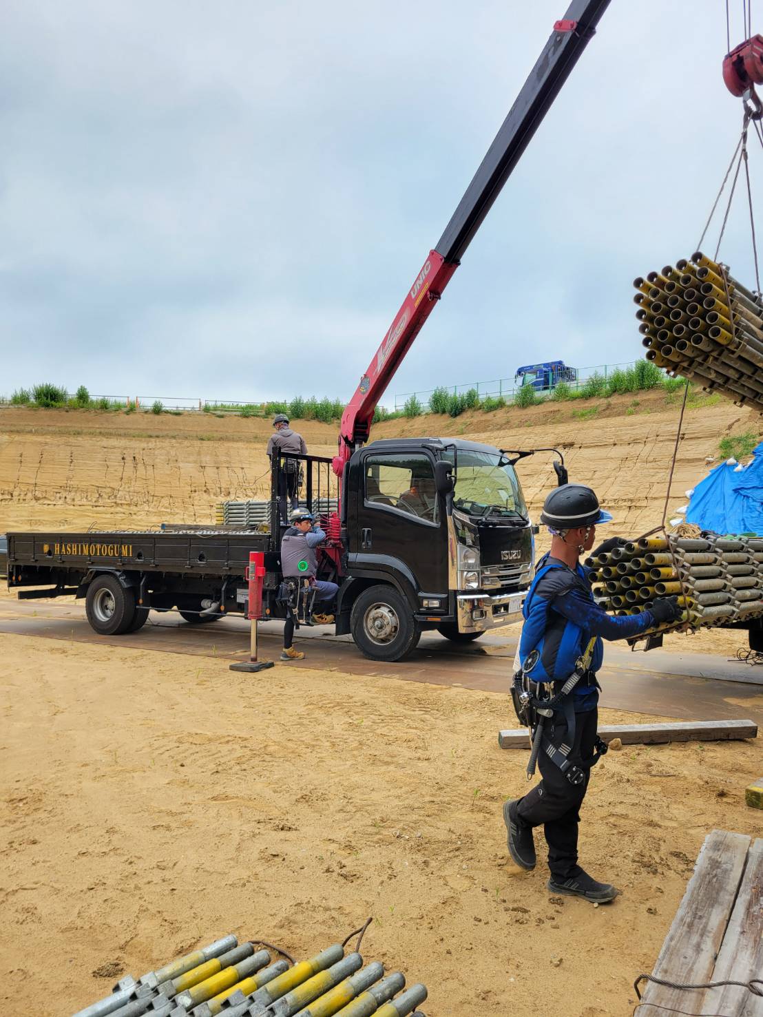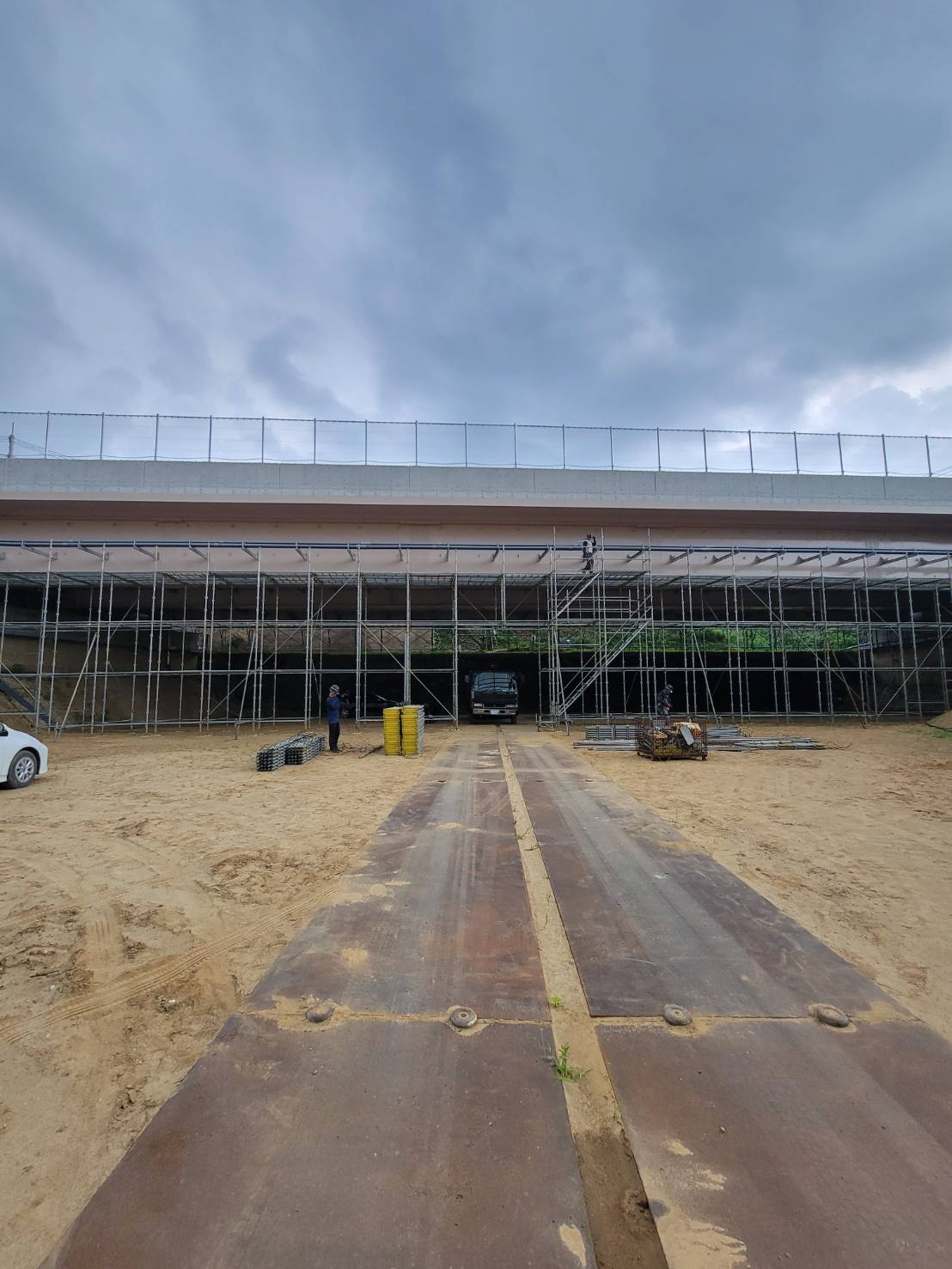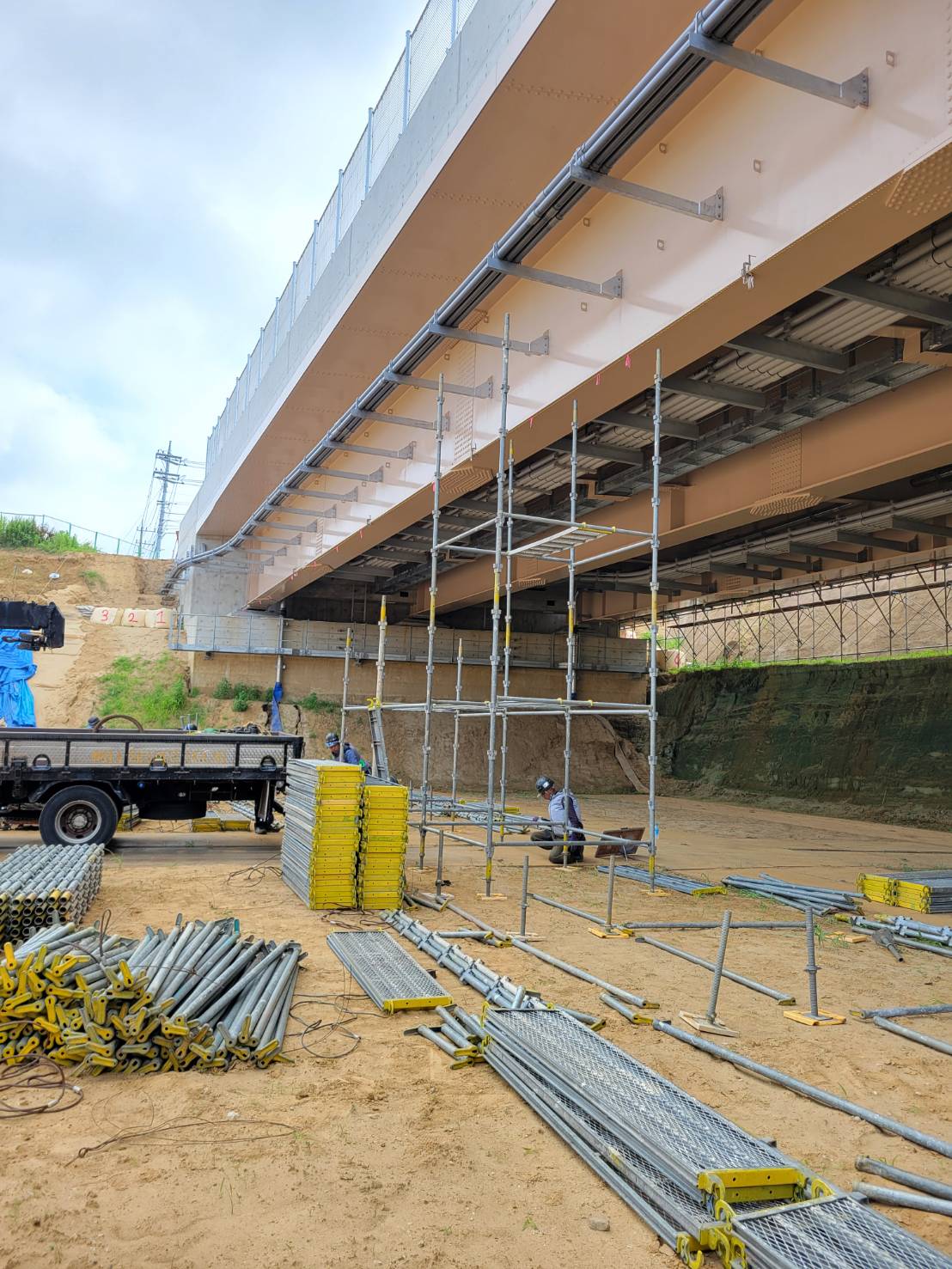 某橋の配管用足場組立て。