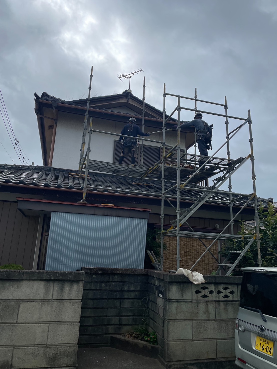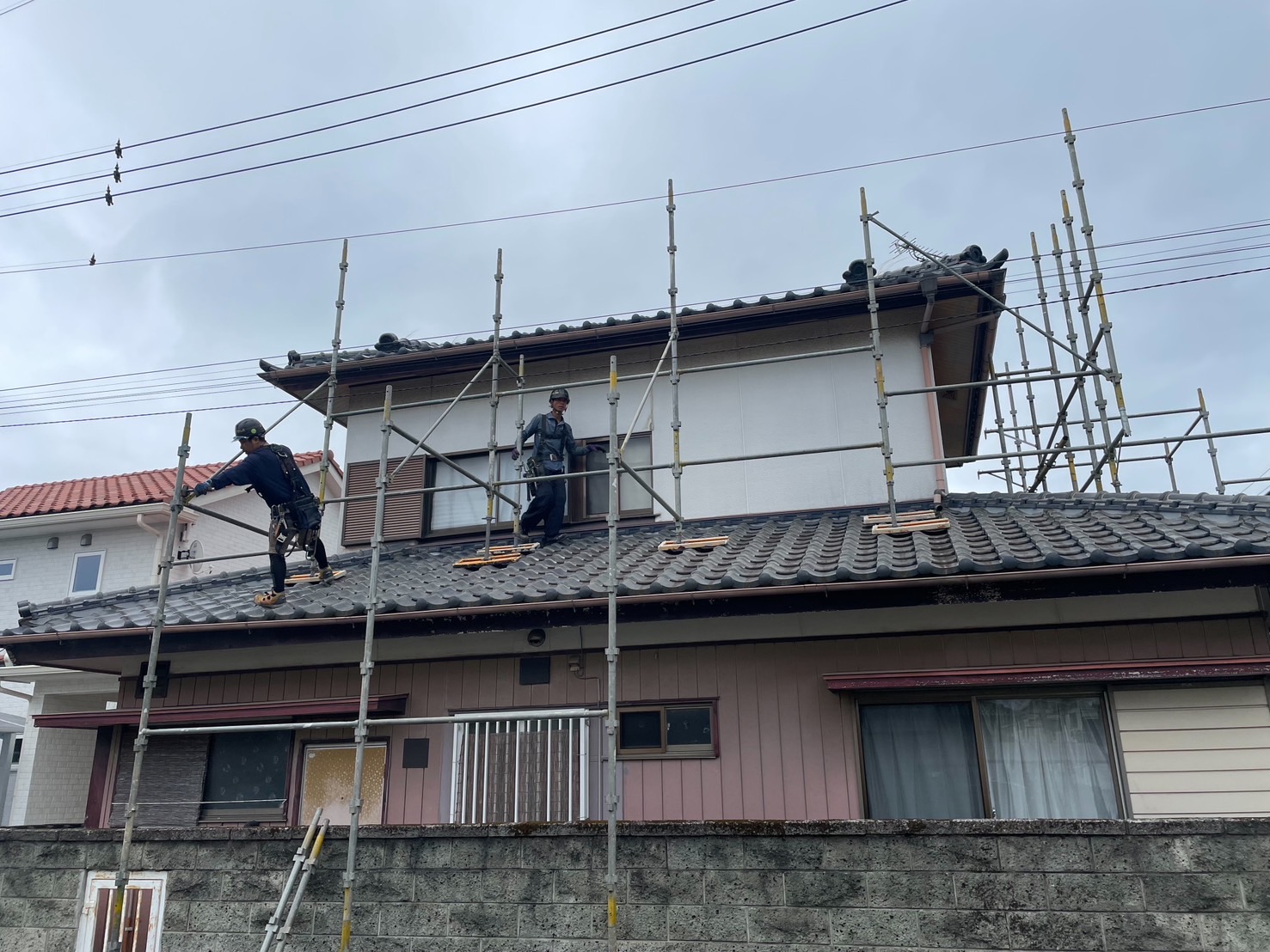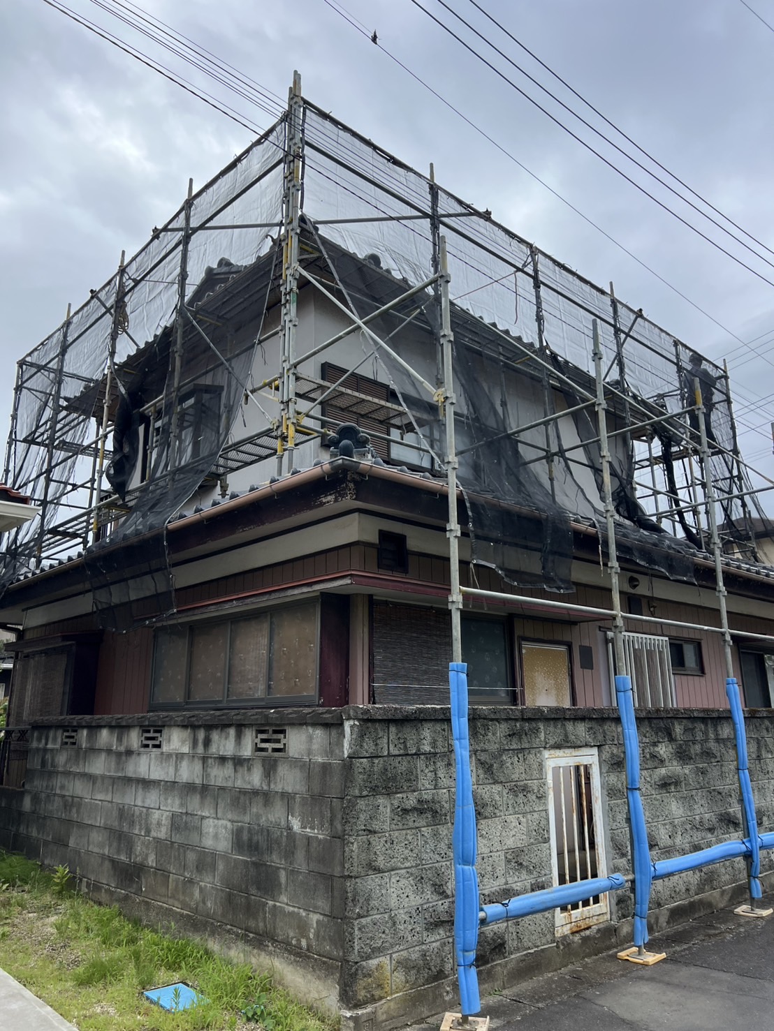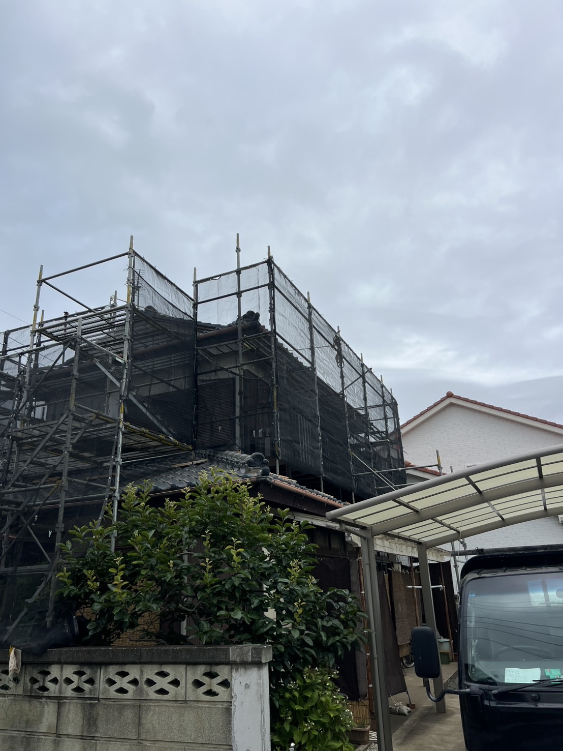 住宅屋根改修用足場組立て完了。